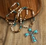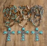 . Cruz con piedras arena y tierra – Inspirado en la calidez de la tierra, este collar mezcla cuentas en tonos beige, marrón y turquesa con destellos dorados.