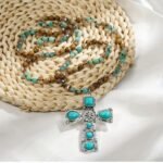 . Cruz con piedras amazonas y jade natural – Combina la fuerza del jaspe marrón con el frescor del jade y piedras en tonos turquesa. Los cristales brillantes añaden un detalle sofisticado.