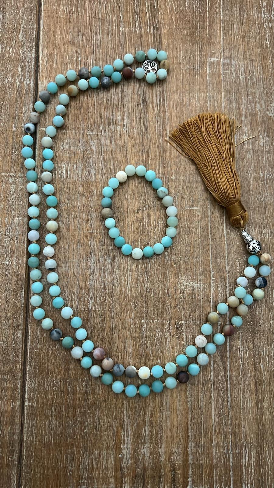 Conjunto Mantra, collar Japamala y pulsera a juego en piedra Amazonita.