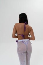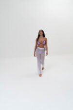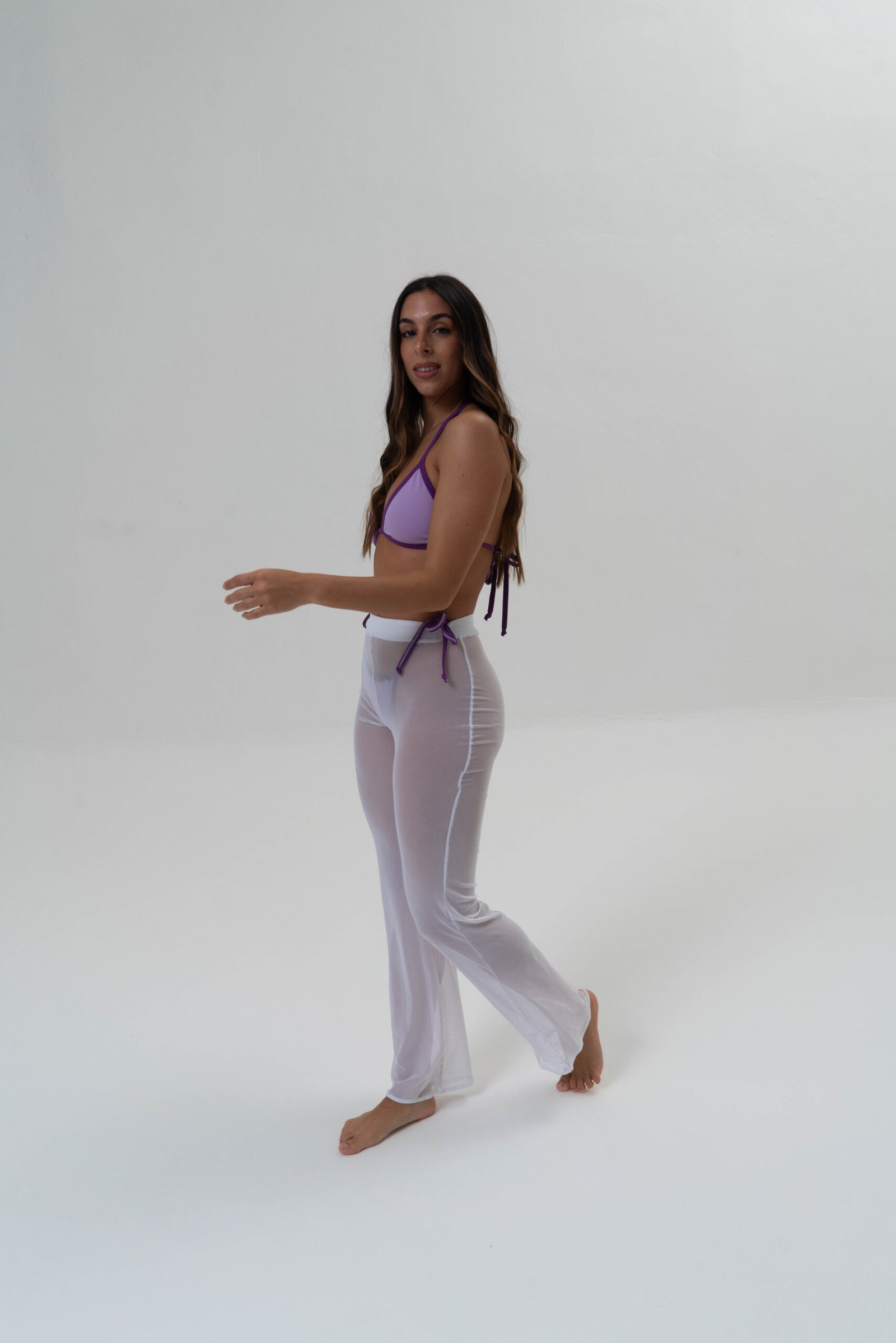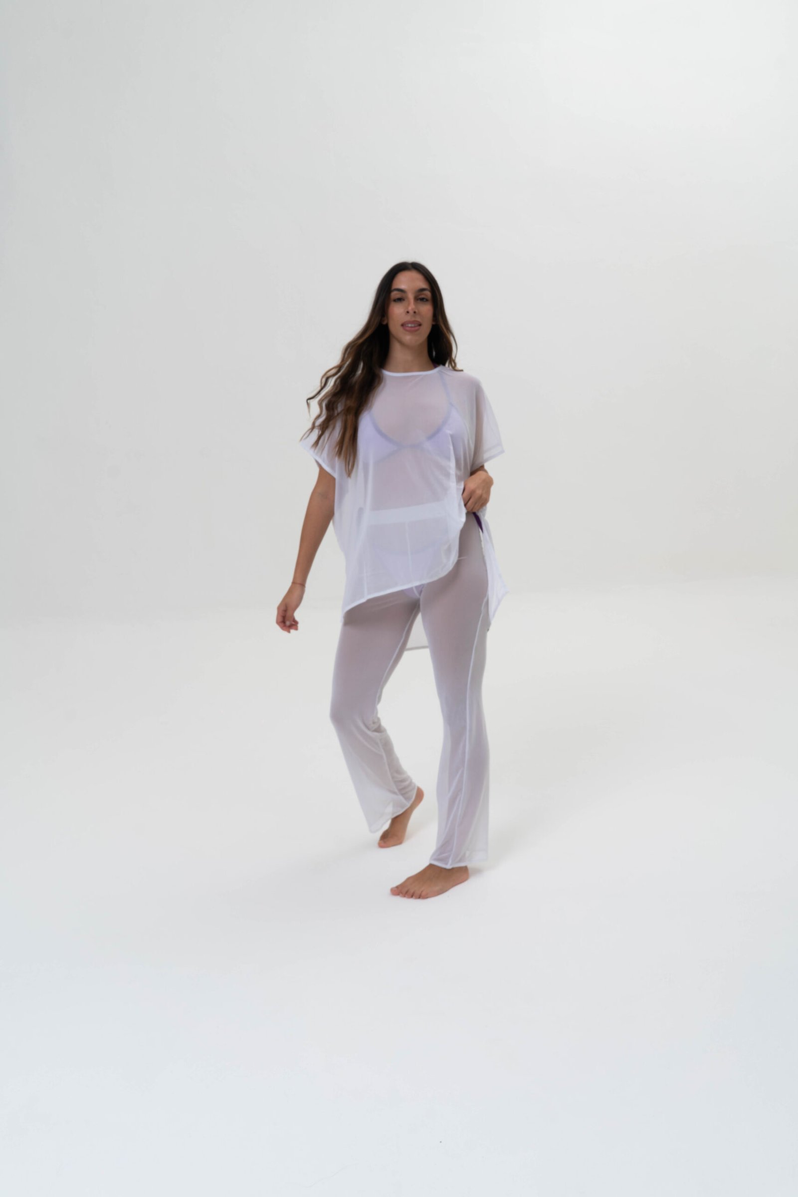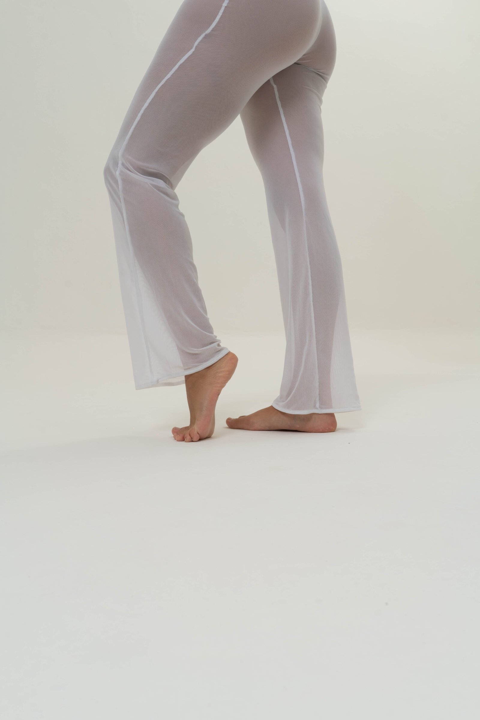 Pantalón marca Madremia, confeccionado en microtul blanco transparente.
