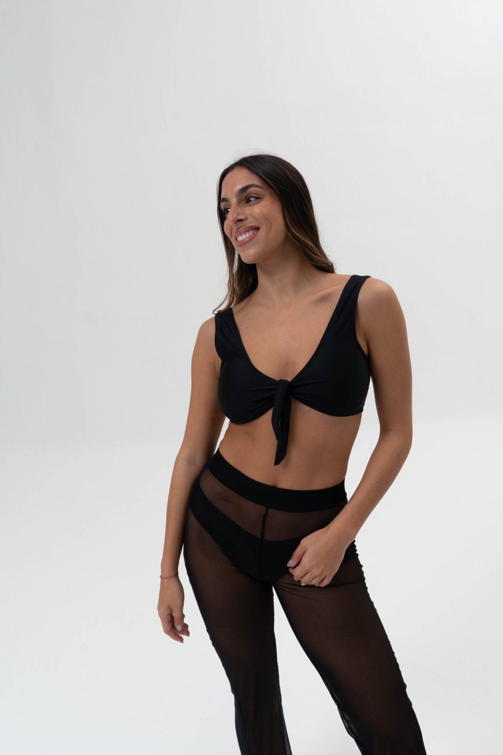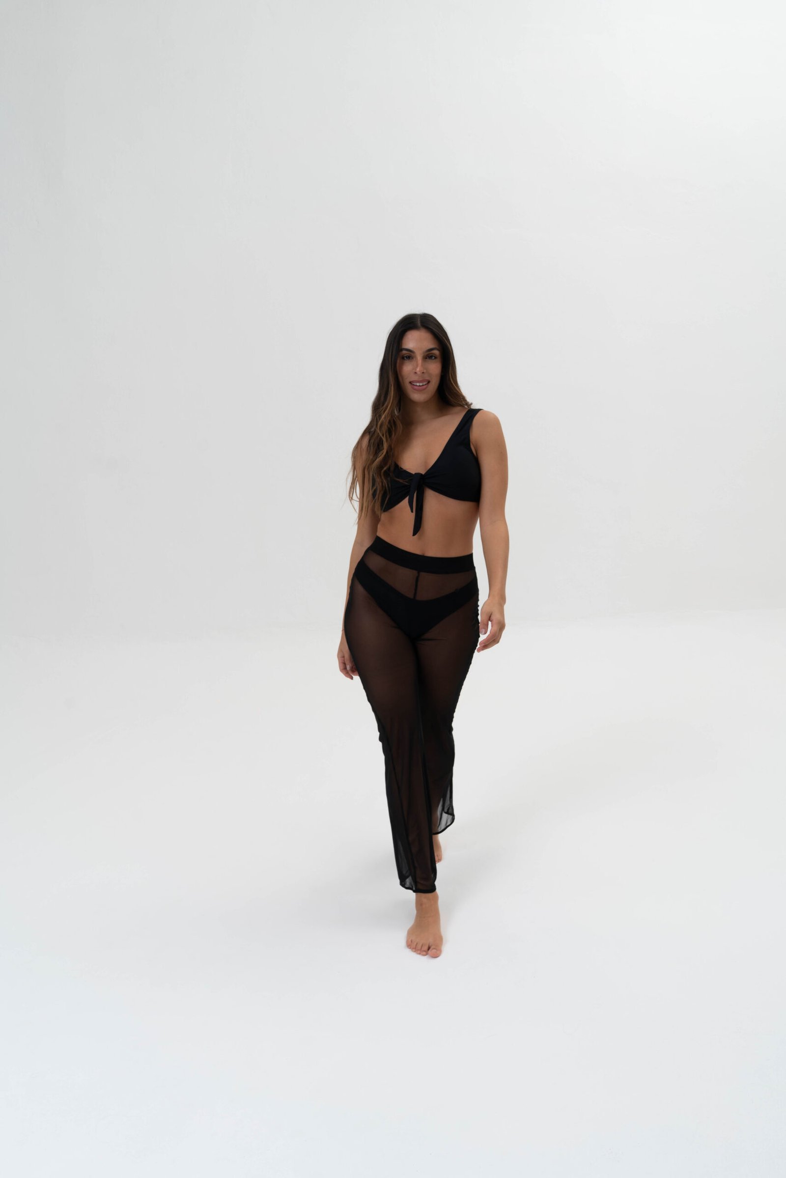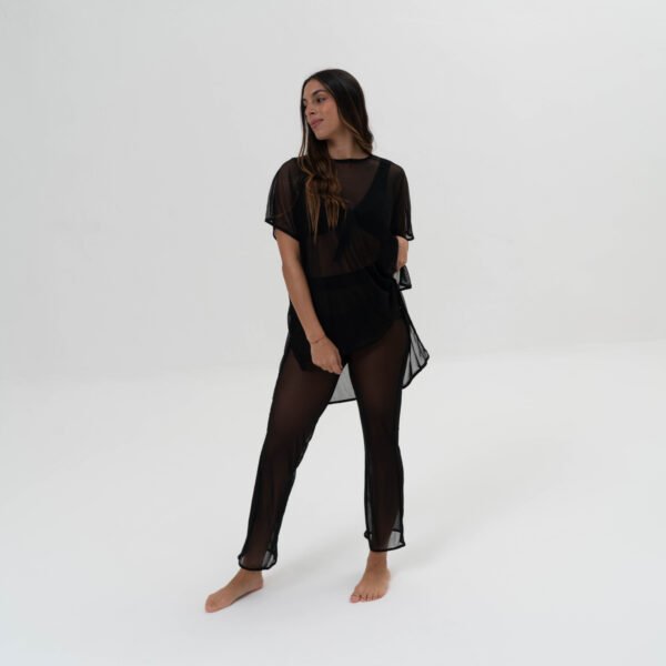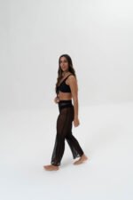Pantalón marca Madremia, confeccionado en microtul negro transparente.