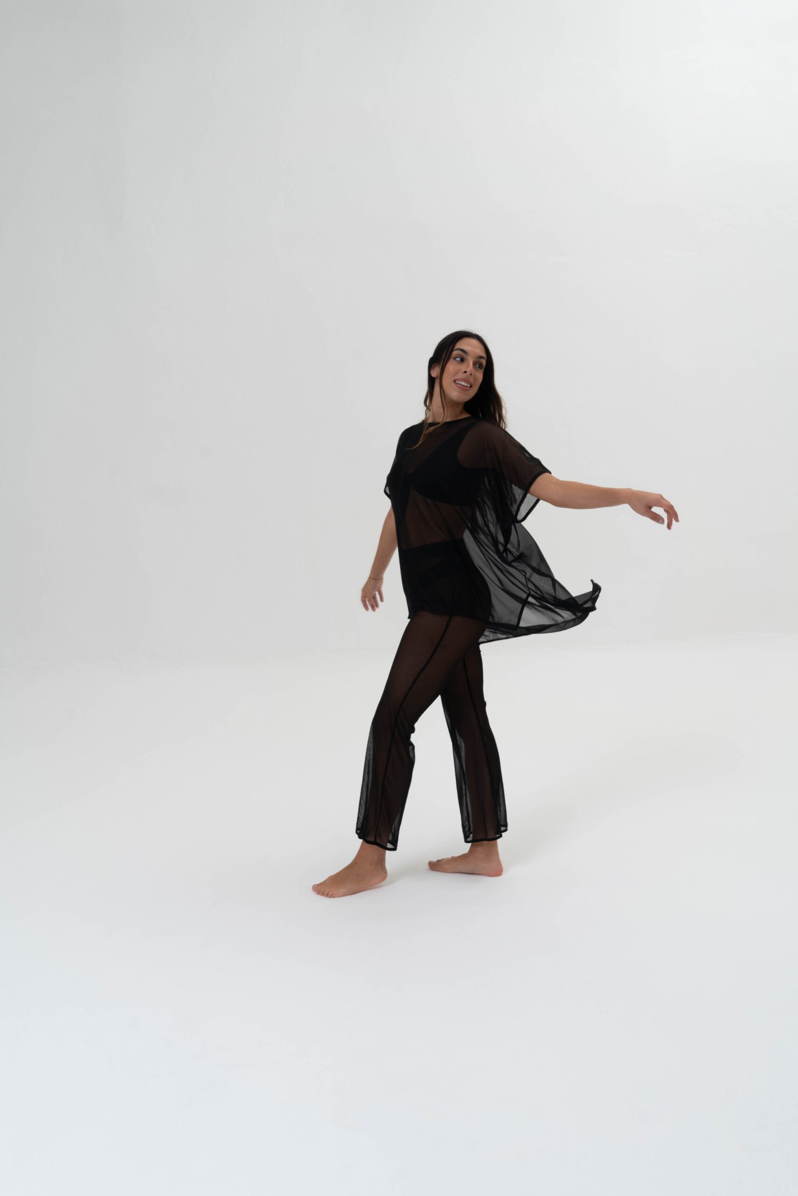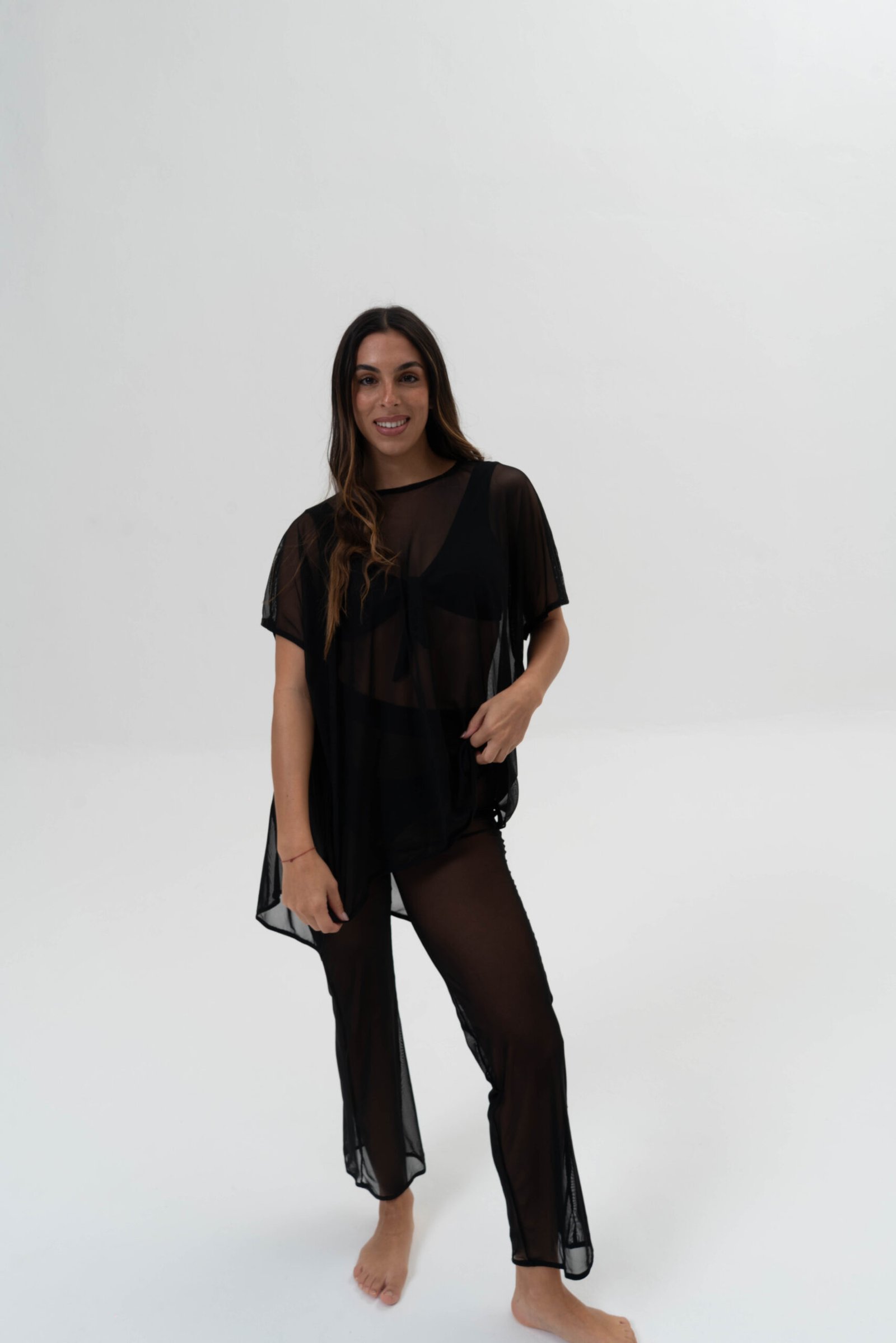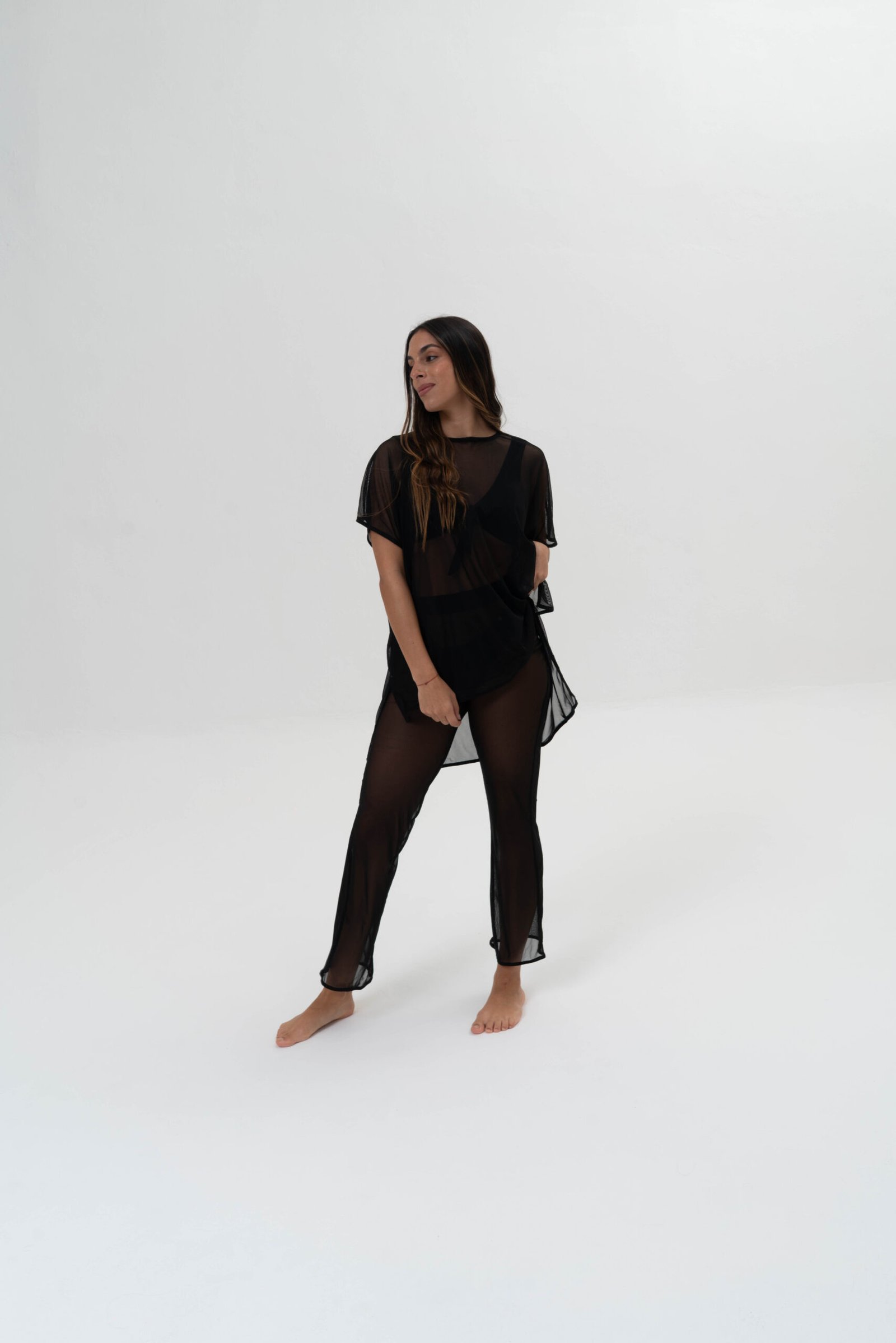 Remeron marca Madremia, confeccionado en microtul negro transparente.
