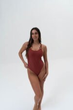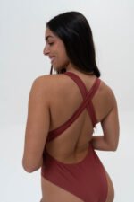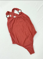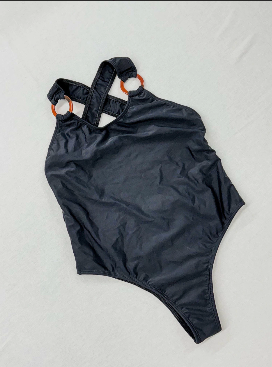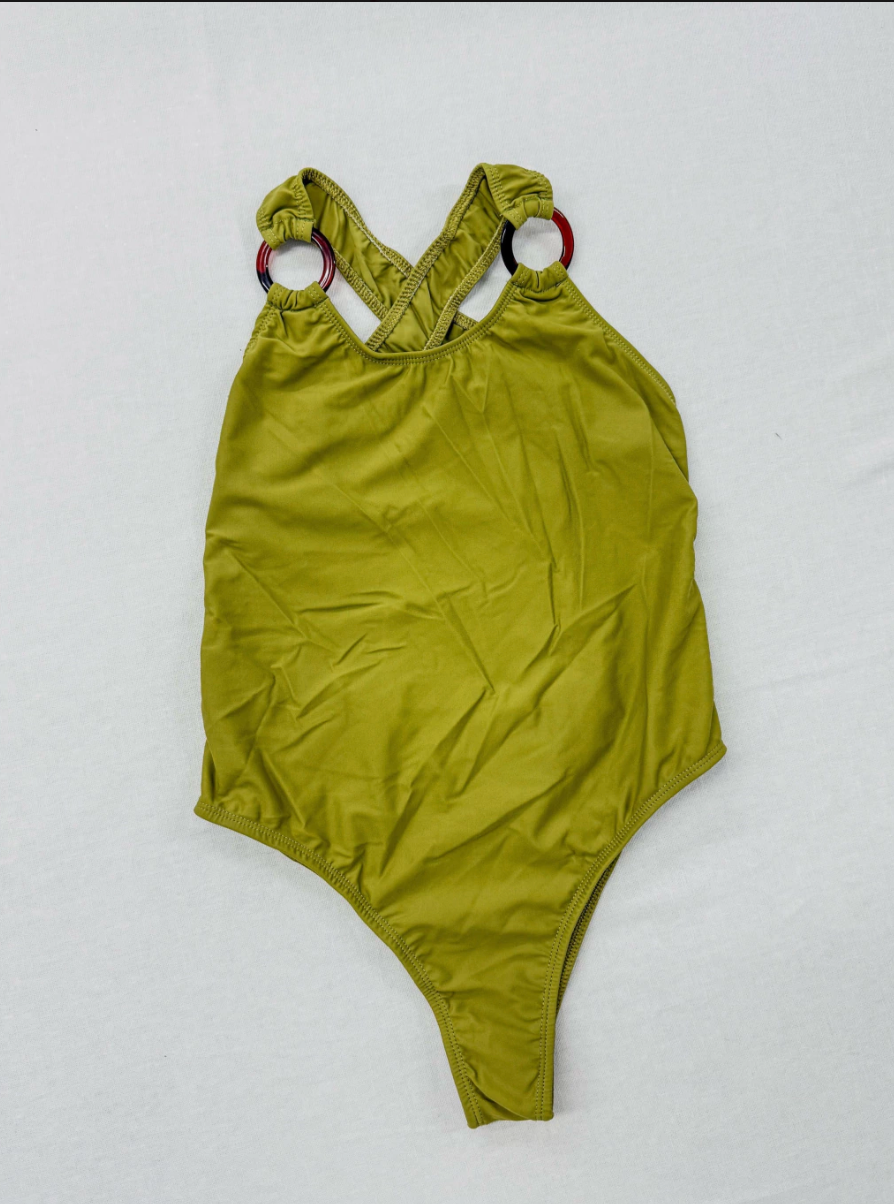 Malla entera con detalle de aro, cruzada atrás estilo natación.