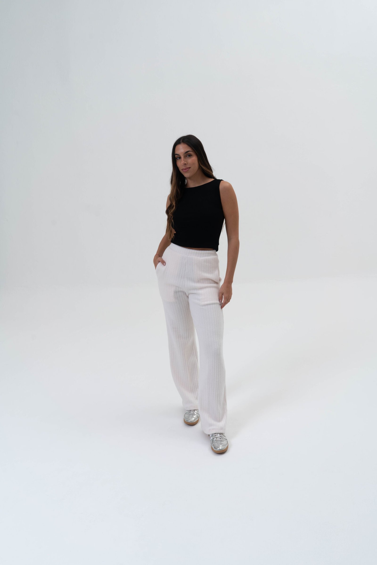 Minimalista, limpio y con ese aire effortless que nunca falla. Este pantalón blanco de algodón grueso es ese básico no tan básico que eleva cualquier look. Su textura firme le da estructura, mientras que el corte relajado asegura comodidad total. Para días de sol, noches frescas o cuando querés verte impecable sin esfuerzo.